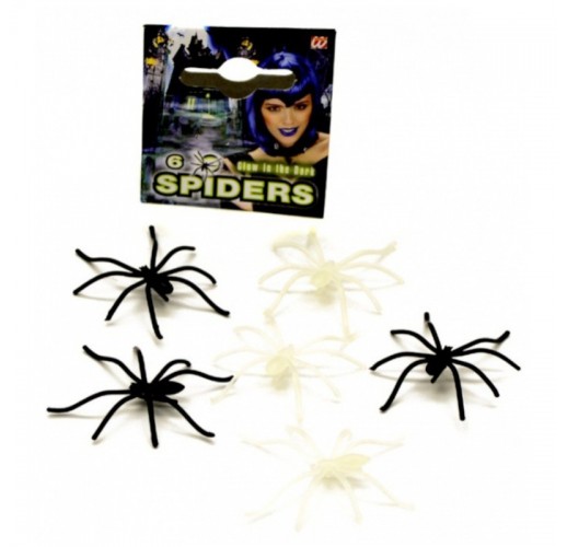 Balení obsahuje tři černé a tři fosforující pavoučky velké 5 cm.