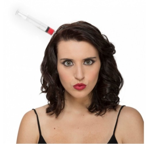 Parádní kanadský žertík v podobě čelenky s injekční stříkačkou zapíchnutou v hlavě, která působí opravdu věrohodným dojmem.