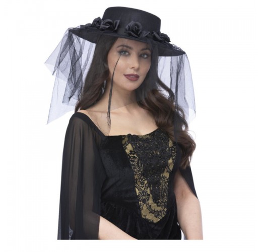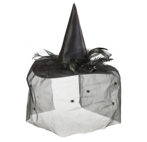 Luxusní černý čarodějnický klobouk s peřím, závojem, květinou a pavoučky.