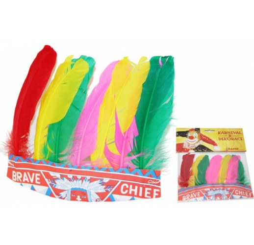 Čelenka je zdobená barevným peřím, je na gumičku.