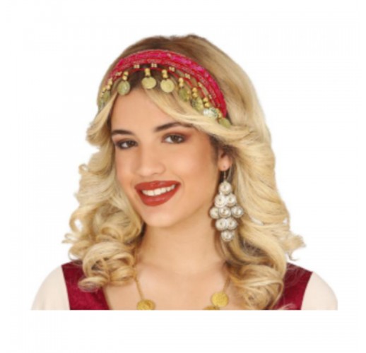 Karnevalová červená čelenka se zlatými penízky.