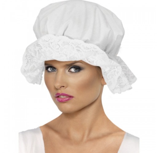 Bílý látkový čepec s krajkou vhodný jako doplněk ke karnevalovému kostýmu chůvy nebo taky služebné či hospodyně.
