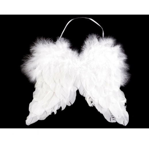 Andělská křídla jsou vyrobena z peří, které je z obou stran nalepené na tvrdém papíru. Mají poutko z atlasové stuhy, díky kterému je můžete pověsit jako ozdobu na stromek, do oken nebo na různé postavičky.