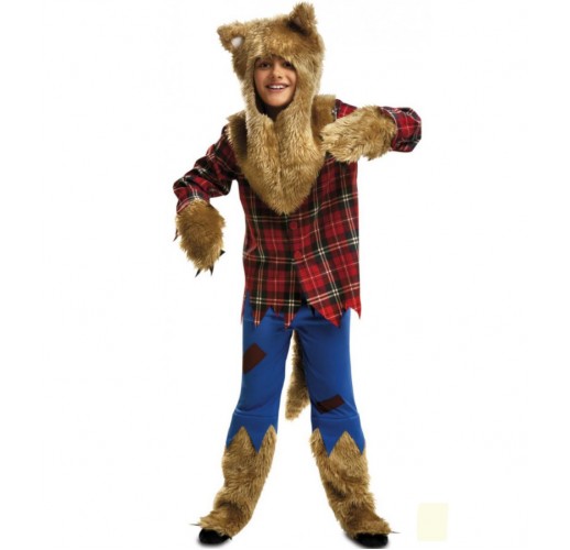 Chlupatá kapuce s ušima a modré kalhoty s našitým ocasem a černými obdélníky.