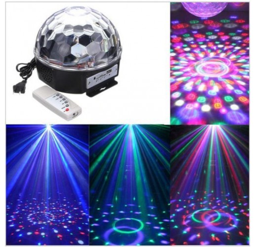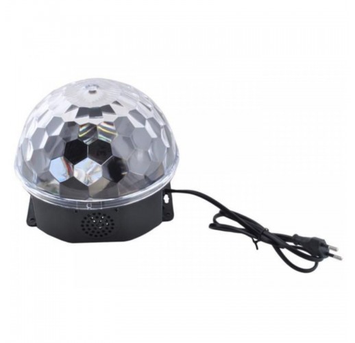 Disco koule má 6 silných, barevných LED diod (červená, zelená, modrá, žlutá, růžová, bílá), které se otáčejí vestavěným motorem a blikají podle rytmu hudby. Má vestavěný zvukový senzor. Připojená koule také svítí bez přehrávání hudby emise různých vzorů (schopnost změnit vzor stisknutím). Kompaktní světelný efekt LED reprodukuje svůj automatický světelný program. Vytváří neobvyklé pozadí na stěnách a stropech. Je možná montáž na zeď a na strop. Projektor má otvory, skrz které budou koule připevněny ke stropu nebo ke zdi. Může být také umístěn kdekoli bez trvalé montáže.