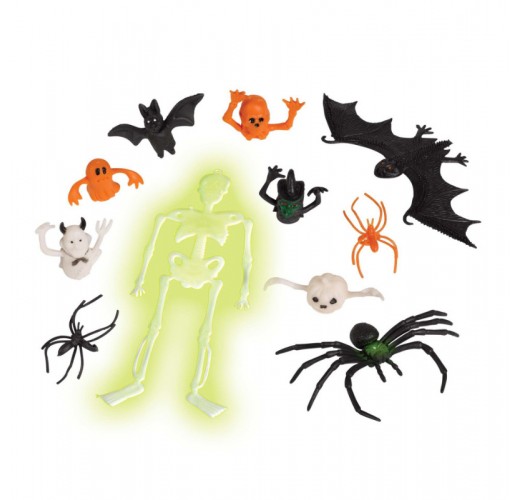 Halloweenská dekorace plastový pavouci, netopýři a ve tmě svítící kostlivci, které jsou vhodné na dekoraci například stolu nebo přímo na zem, poté dodají večeru skvělou atmosféru.