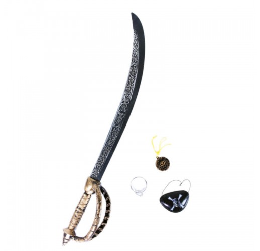 Balení obsahuje vzorovaný meč s úchvatnou rukojetí, pirátskou klapku na oči, náhrdelník s motivem lebky a stříbrný kroužek do ucha.