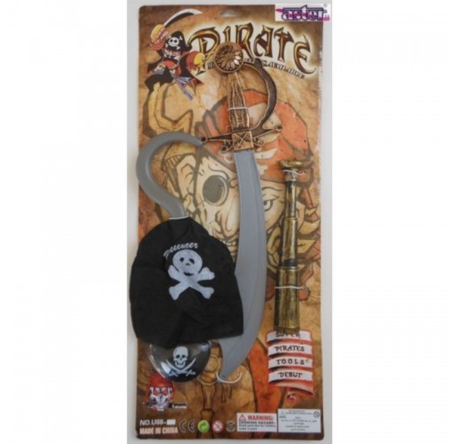 Sada pirát obsahuje šavli, hák, klapka na oko a dalekohled.
