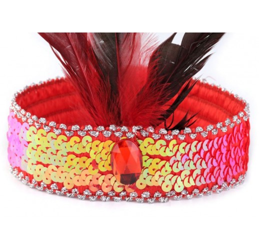 Karnevalová čelenka flitrová s peřím retro červená