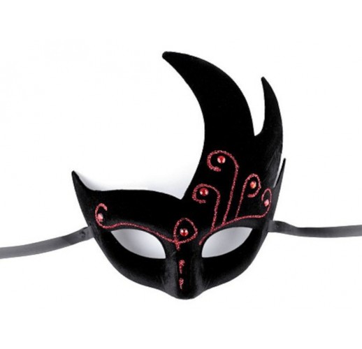 Zdobí ji broušené kamínky a glitrové kresby. Maska se zavazuje pomocí saténové stuhy.
