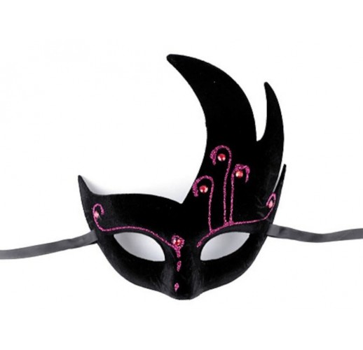 Zdobí ji broušené kamínky a glitrové kresby. Maska se zavazuje pomocí saténové stuhy.