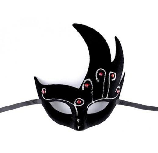 Zdobí ji broušené kamínky a glitrové kresby. Maska se zavazuje pomocí saténové stuhy.