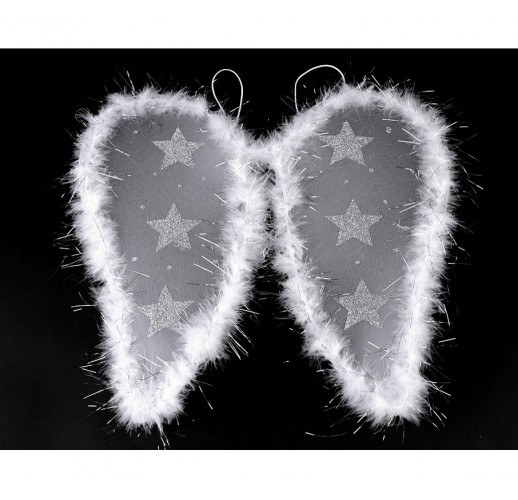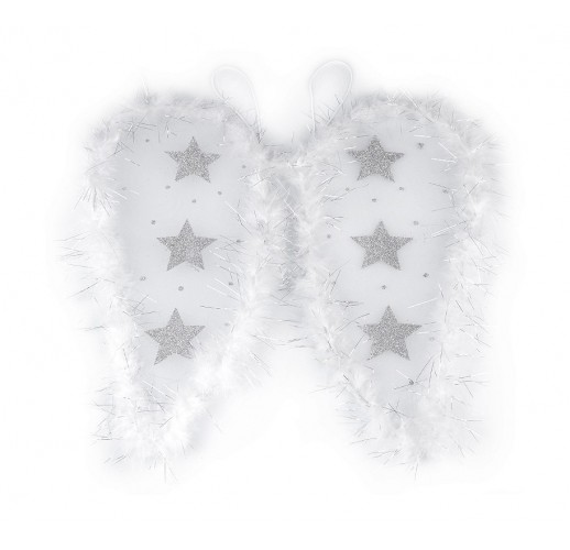 Andělská křídla jsou nejdůležitější součástí andělského kostýmu. Připevňují se pomocí dvou gumiček, které se navléknou na ramena. Pevná drátěná konstrukce je po obvodu ozdobená lemem z peří a lurexovými vlákny. Na křídlech jsou glitrové hvězdy a puntíky, jenž křídlům propůjčují nadpozemský třpyt.