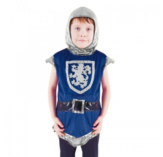 Souprava zahrnuje černé kalhoty a stříbrno-modrý horní díl, který je dekorován rytířským erbem a páskem.