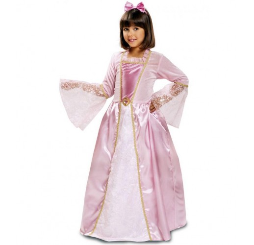 Dlouhé světle růžové šaty s dlouhými rozšířenými rukávy, které jsou u loktů zdobené zlatou stužkou.