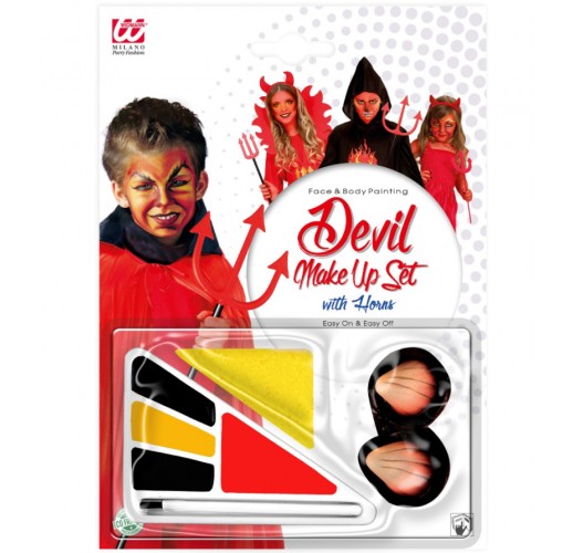 Sada líčidel čert obsahuje: 4 barvy v kalíšku, štěteček, samonalepovací latexové rohy a namáčecí houbička