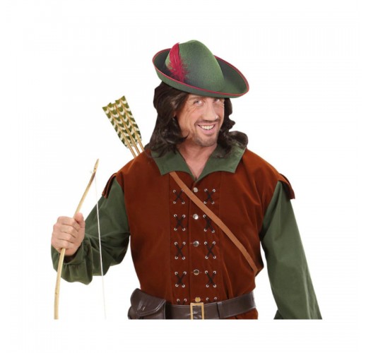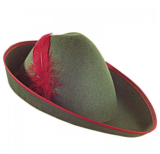 Zelený klobouk plstěného vzhledu s červeným pérem, vhodný jako doplněk ke kostýmu myslivce nebo třeba krále zbojníků.