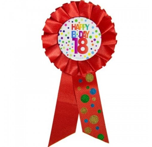 Barevný narozeninový odznak s nápisem HAPPY B DAY 18 pro jasné rozlišení oslavence od ostatních hostů party.