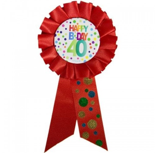 Barevný narozeninový odznak s nápisem HAPPY B DAY 40 pro jasné rozlišení oslavence od ostatních hostů party.