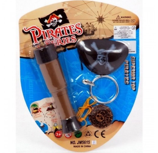 Set obsahuje dalekohled, klapku na oko, náušnici a pirátskou minci na krk.