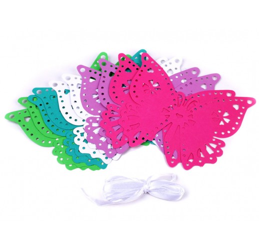 Součástí balení je saténová stuha, kterou provlečete dírkami na motýlech.