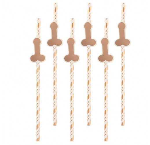 Party papírová brčka v rosegold barvě s ozdobou ve tvaru penisu.