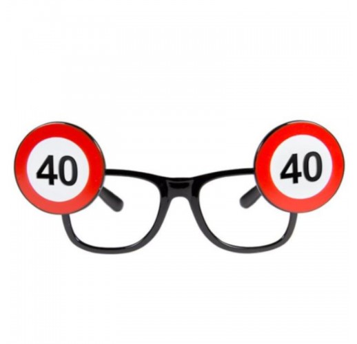 Brýle bez skel jsou vyrobené z plastu a na krajích jsou zdobené číslem 40 ve tvaru dopravní značky.