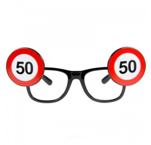 Brýle bez skel jsou vyrobené z plastu a na krajích jsou zdobené číslem 50 ve tvaru dopravní značky.