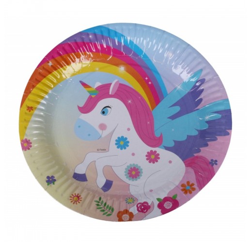 Papírové párty tácky jednorožec. Balení obsahuje 6 ks. Průměr tácku je 23,5 cm.