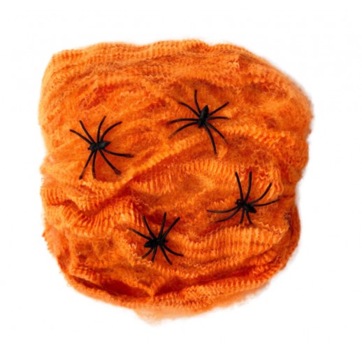 Tato oranžová síť má 60 gramů a součástí jsou 4 černí plastoví pavoučci ve velikosti 3 cm.