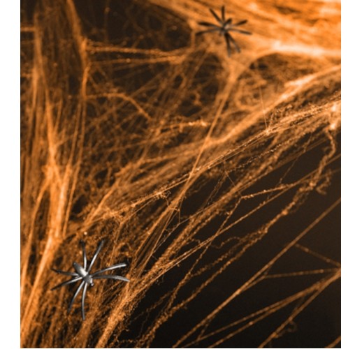 Pavučina s pavouky - oranžová. Balení obsahuje velkou pavučinu, kterou hravě pokryjete svou Halloween party dekoraci, dva ošklivé pavouky.
