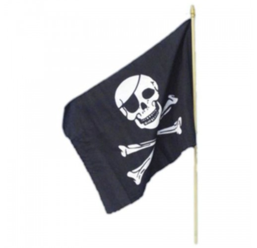 Pirátská vlajka s dřevěnou tyčkou a koncovkou.