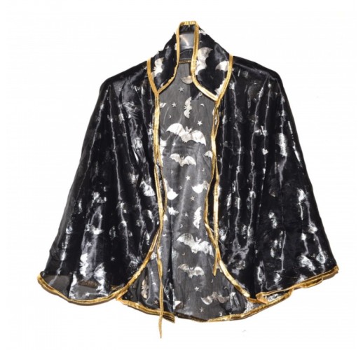 Doplněk ke karnevalové masce - čarodějnický plášť. Tento přehoz je černé barvy s obrázky stříbrných netopírů. Plášť má límec a vázání na šňůrku u krku.