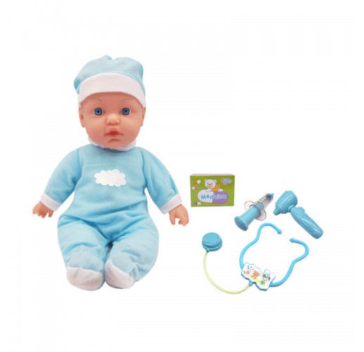 Balení obsahuje miminko, fonendoskop, injekci, kukátko do uší.