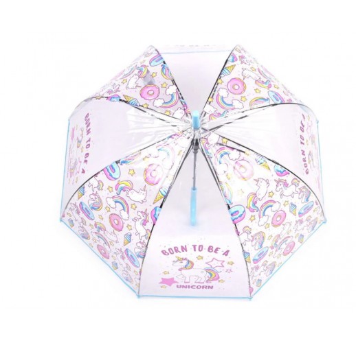 Pevný průhledný potah deštníku s milým potiskem trendy jednorožců je doslova uchvátí.