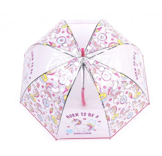 Pevný průhledný potah deštníku s milým potiskem trendy jednorožců je doslova uchvátí.