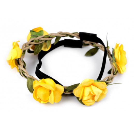 Na spleteném copánku jsou pevně přilepené papírové květy. Drobné textilní lístky jsou vpletené dovnitř copánku. Zadní část tvoří pružná guma široká 0,7 cm. Čelenka pevně drží a nepadá, je velice příjemná na nošení.