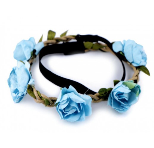 Na spleteném copánku jsou pevně přilepené papírové květy. Drobné textilní lístky jsou vpletené dovnitř copánku. Zadní část tvoří pružná guma široká 0,7 cm. Čelenka pevně drží a nepadá, je velice příjemná na nošení.