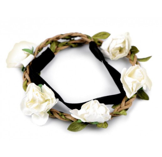 Na spleteném copánku jsou pevně přilepené papírové květy. Drobné textilní lístky jsou vpletené dovnitř copánku. Zadní část tvoří pružná guma široká 0,7 cm. Čelenka pevně drží a nepadá, je velice příjemná na nošení.