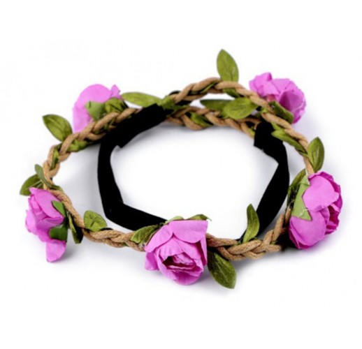 Na spleteném copánku jsou pevně přilepené papírové květy. Drobné textilní lístky jsou vpletené dovnitř copánku. Zadní část tvoří pružná guma široká 0,7 cm. Čelenka pevně drží a nepadá, je velice příjemná na nošení.
