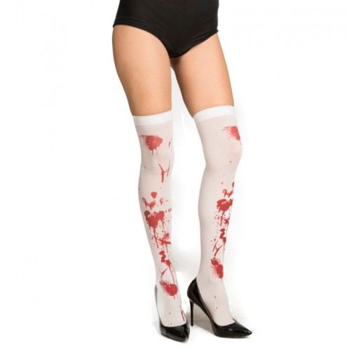 Bílé nadkolenky se skvrnami od krve, vhodný ke kostýmu na Halloween.