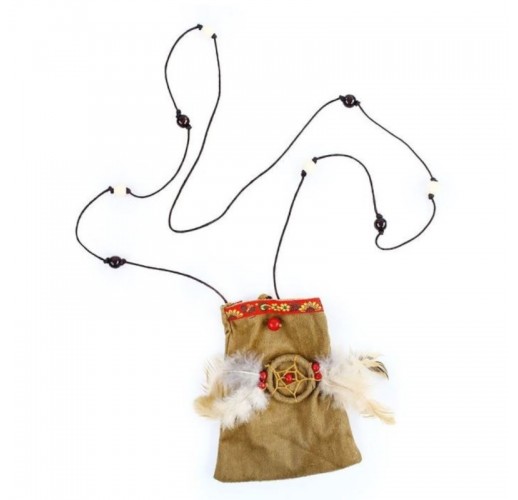 Indiánský pytlík s dřevenými korálky a peřím.