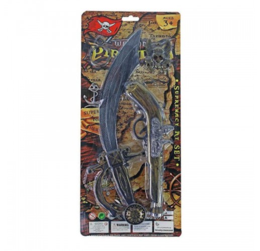 Set obsahuje stříbrný meč s bronzovou rukojetí, bronzovou pistoli, náušnici a pirátský přívěšek.
