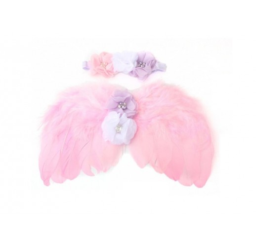 Sada pro miminko křidýlka na focení růžová s květovanou čelenkou (č23)