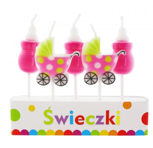 Sadu tvoří 2ks svíček znázorňujících kočárek a 3ks svíček představujících dětskou lahev.
