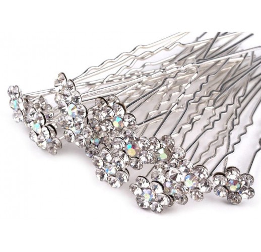Květinky měří Ø6mm, délka 60mm. Elegantní sponky, které každý účes povýší nejméně o dvě třídy výš. Kamínky jsou skleněné, broušené, takže se na slunci i umělém světle budou třpytit, což výsledný dojem ještě umocní. Ozdobí nejen společenské účesy, ale i nevěsty v jejich velký den.