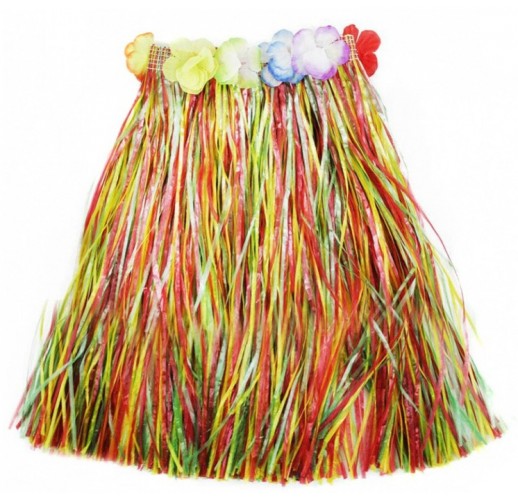 Tento senzační kousek je ideálním doplňkem na karneval nebo k typickému havajskému tanci "HULA". Sukně dlouhá 45 cm je vyrobena z tenkých igelitových pásků v různých barvách a zdobena barevnými okvětními lístky.