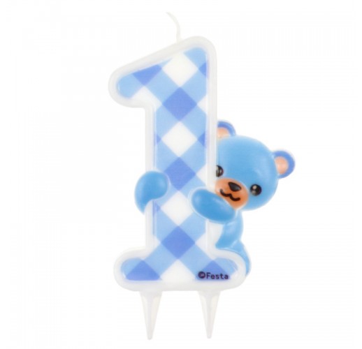 Svíčka ve tvaru číslice 1 v modré barvě s medvídkem.