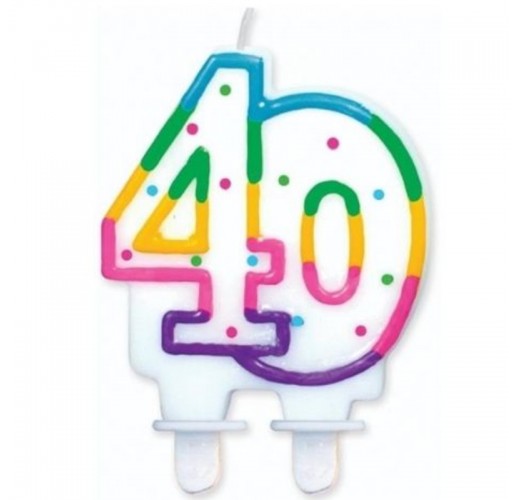 Svíčka ve tvaru číslice 40, zdobená barevnými puntíky.