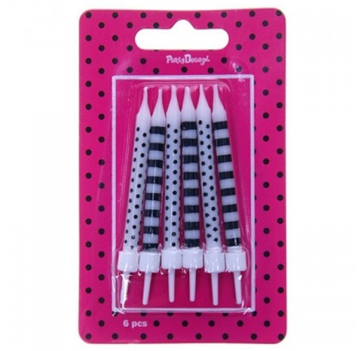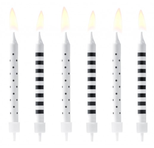 Narozeninové dortové svíčky v barvách bílá a černá s puntíky a proužky.
